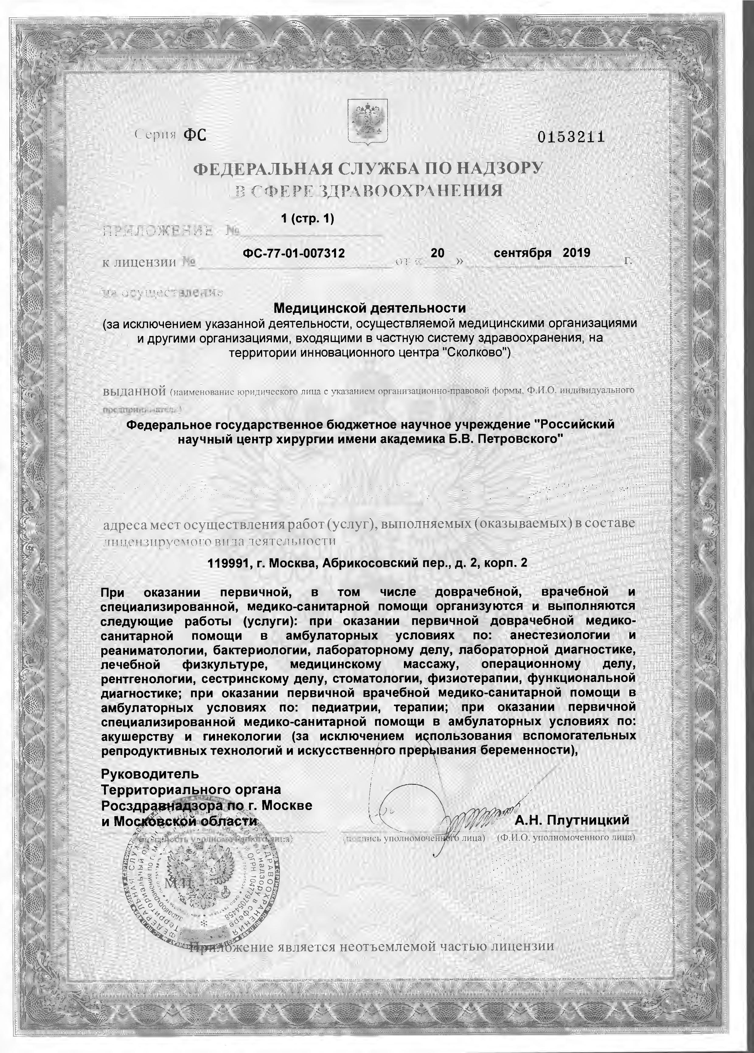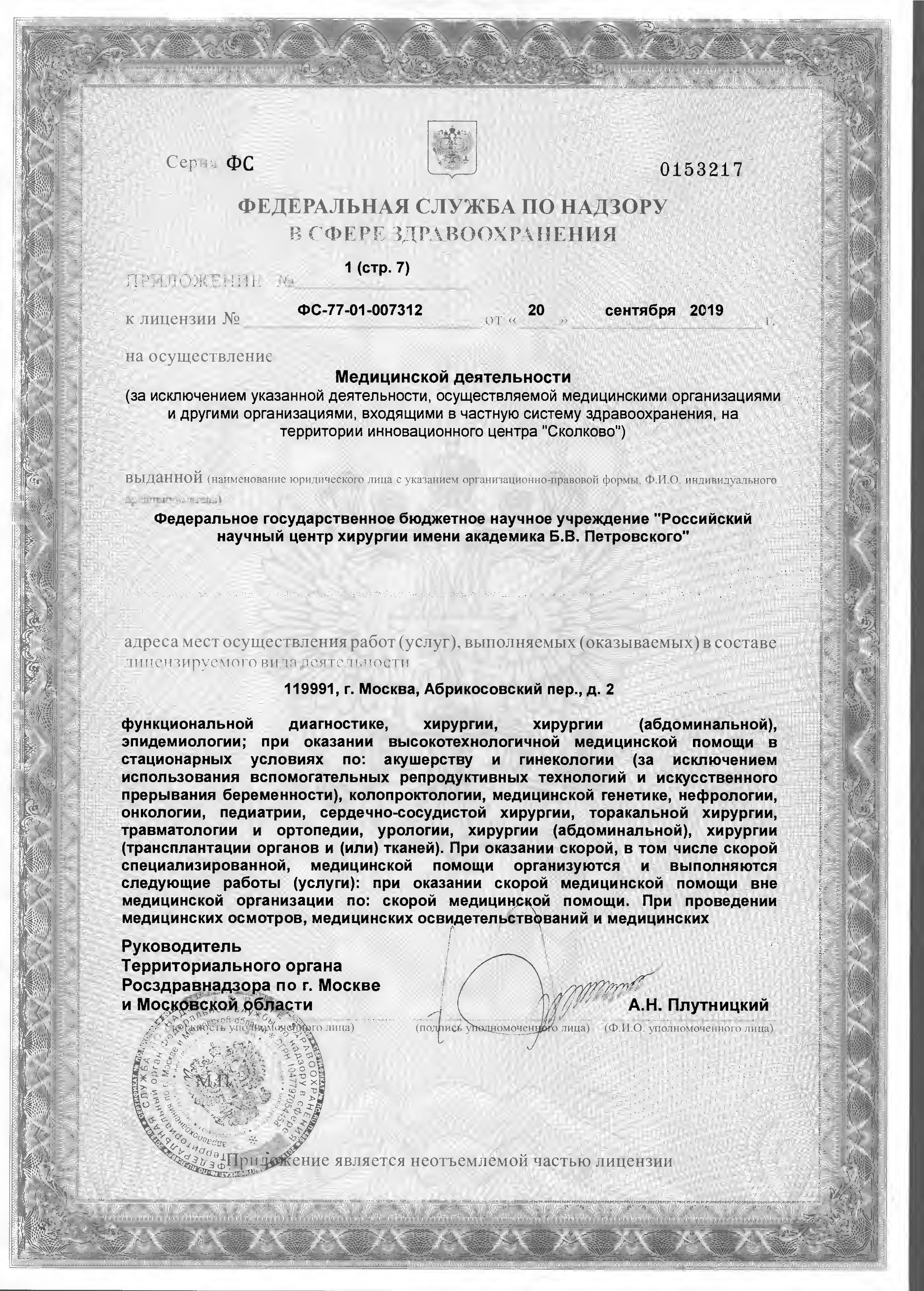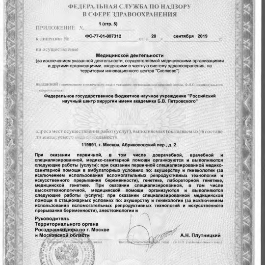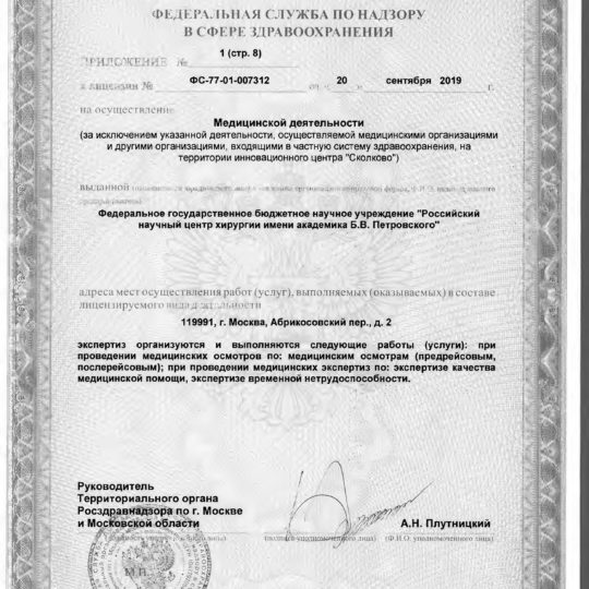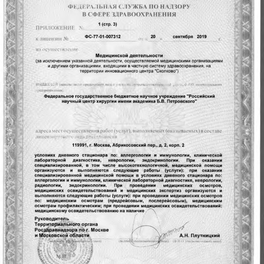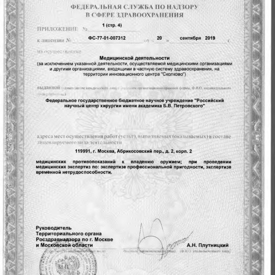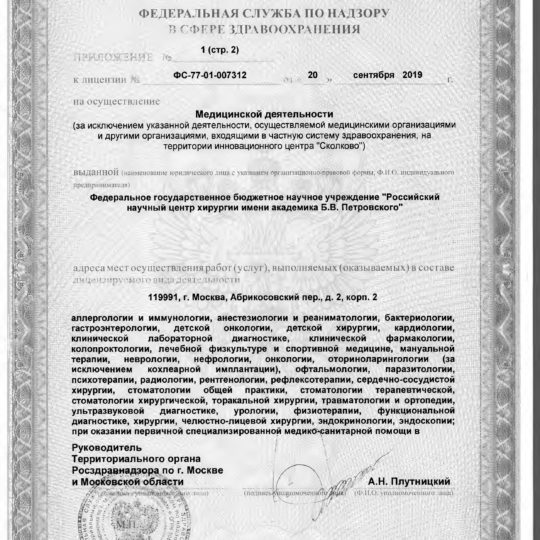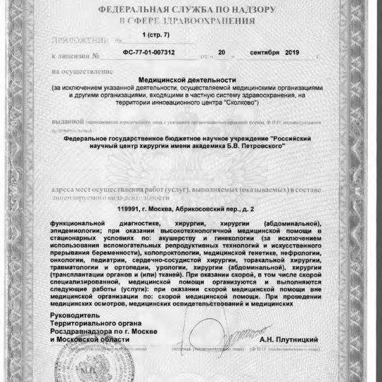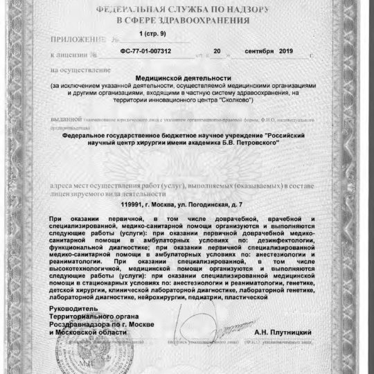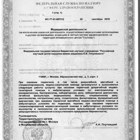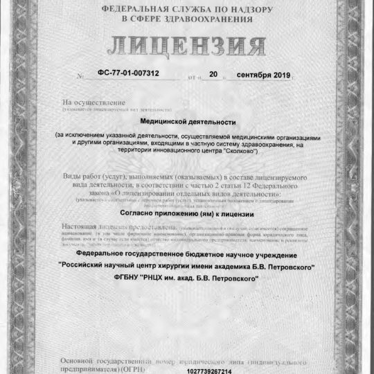 ФГБНУ «РНЦХ им.акад. Б.В. Петровского» ОГРН: 1027739267214 ИНН: 7704030124 119991, г. МОсква, Абрикосовский пер., д.2